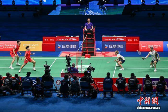 9月20日,在广东深圳举行的2025中国羽毛球大师赛混双比赛中,中国组合冯彦哲(左一)/黄东萍(左二)不敌马来西亚组合陈堂杰(右一)/杜依蔚(右二),无缘决赛。中新社记者 陈骥旻 摄