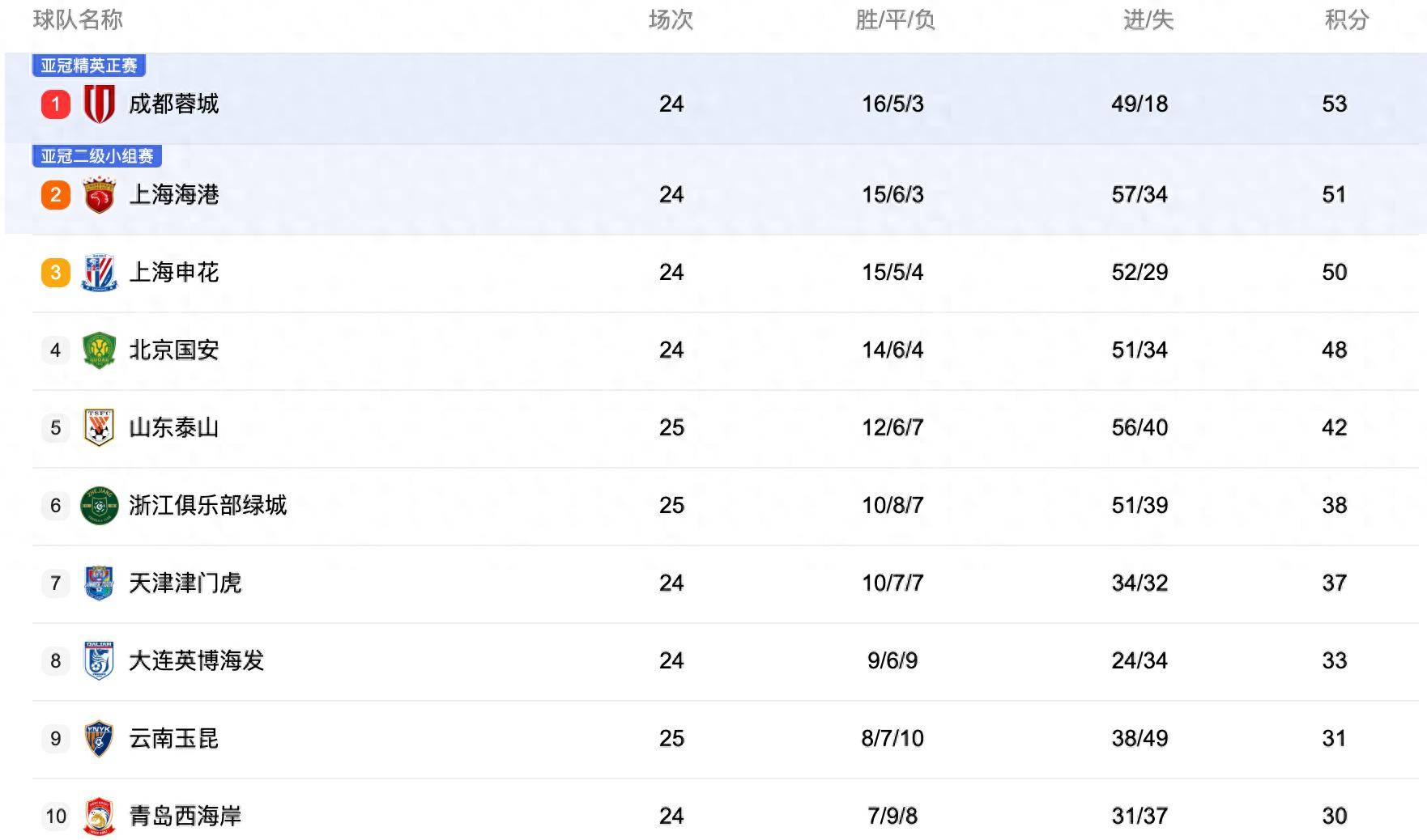 北京时间9月21日讯,随着中超联赛第25轮的继续进行,积分榜形势愈发复杂,前三名之间的差距已经缩小到仅有3分。本轮的较量将直接影响上海海港和上海申花能否赶上领头羊成都蓉城的步伐。与此同时,降级区的竞争也进入白热化阶段,本轮长春亚泰与梅州客家的平局让两队分别收获了宝贵的1分。如今,他们与青岛海牛同积17分同时点滴,降级的悬念仍然未解,五轮赛季过后,谁能逃脱困境仍充满变数。