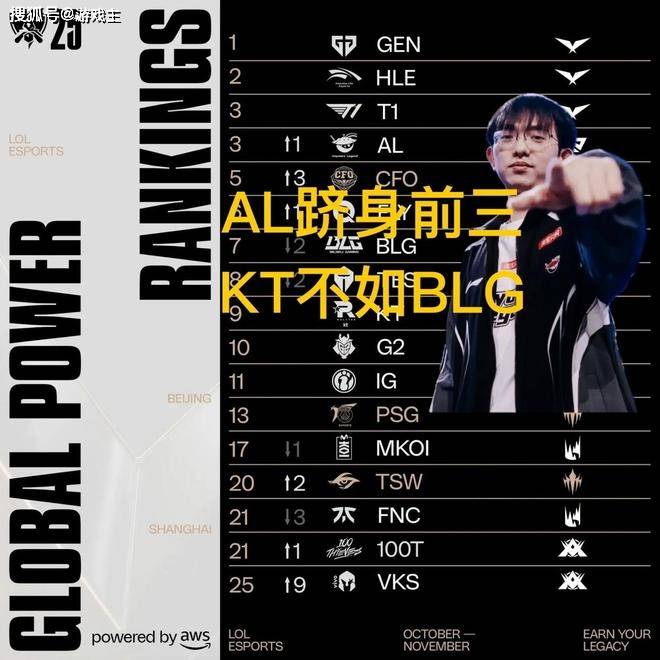 大家好,S15赛季的比赛已经正式开始了,相信绝大多数的玩家都关注了最近一段时间的对抗,世界赛的比赛进行的是非常激烈的,随着瑞士轮的逐渐进行,各大战队的整体状态也渐渐凸显出来,lpl和lck之间的差距变得越来越明显。就在最近,官方也是再一次更新了战队的世界榜单,让粉丝们比较意外的是,这一次lpl赛区竟然有队伍进入到前三了,al战队和T1战队并列第三,更意外的应该是kt战队,他们已经进入到了八强,结果却排在了第九的位置,blg战队打成了这个样子,还在第七。