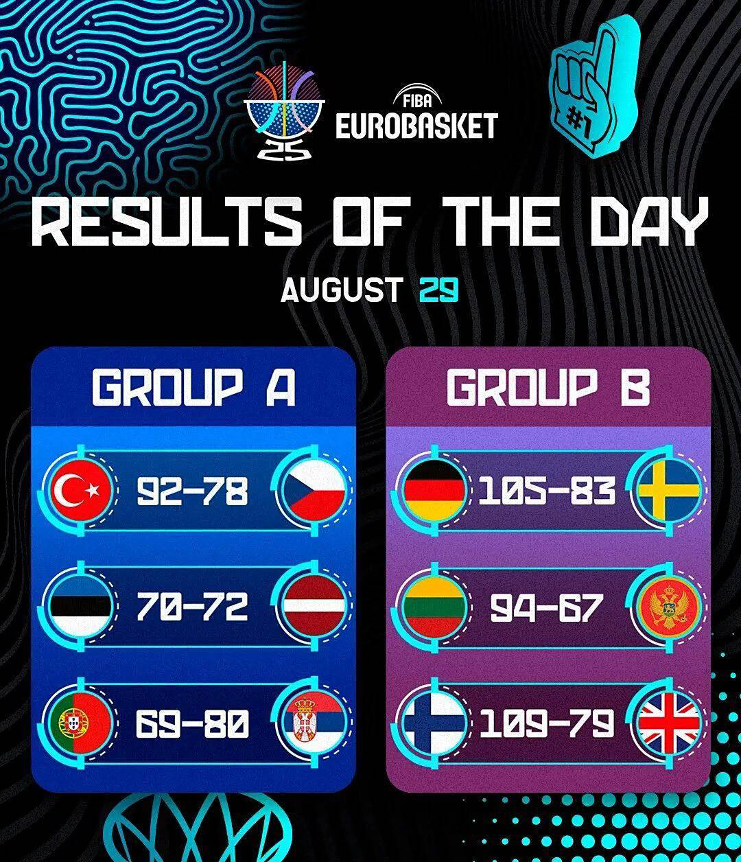 今天是北京时间8月30日,欧洲杯男篮小组赛继续激烈进行。让我们先来了解一下今天的比赛结果:塞尔维亚以80比69战胜葡萄牙;芬兰则109比79大胜英国;拉脱维亚险胜爱沙尼亚,比分是72比70;立陶宛以94比67击败黑山;土耳其92比78力克捷克;而德国105比83击败瑞典。