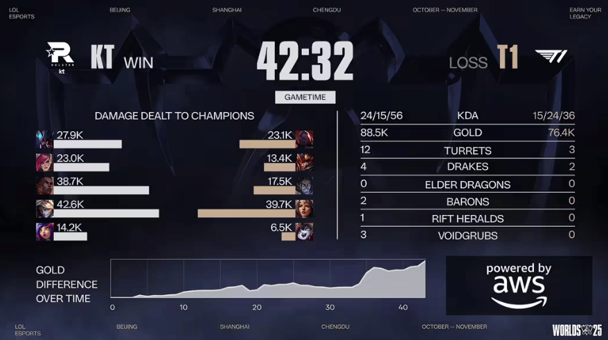 在2025年11月9日20:08,成都东安湖体育公园多功能体育馆内,一场备受瞩目的英雄联盟全球总决赛冠亚军决赛拉开帷幕,T1与KT这两支劲旅展开了激烈对决。KT以连胜的姿态首次闯入总决赛的舞台,他们带着满满的斗志,渴望能一举夺得首冠;而T1则是剑指队史第六冠,有着丰富的大赛经验和强大的实力。